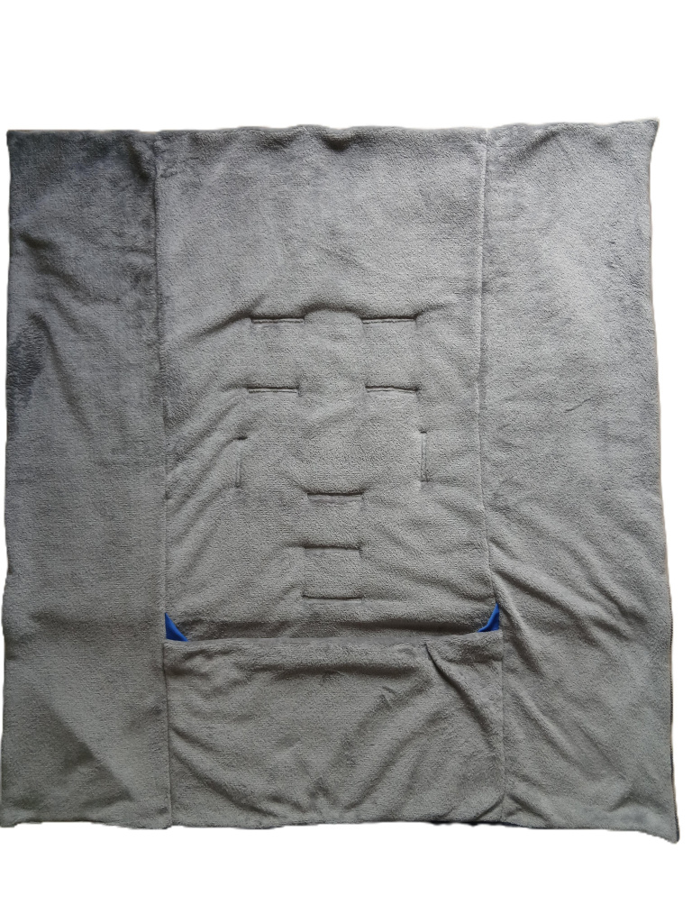 V dolním okraji je kapsa, která chrání děti od chladu, nebo se může otočit a vznikne průvlak a dítě může mít nohy vystrčené ven.